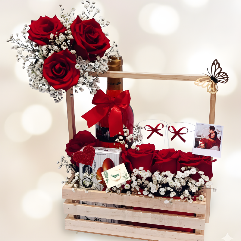 Desde la pasión de sus rosas rojas premium acompañado de un buen vino de selección hasta el brindis compartido con nuestras copas artesanales y la dulzura de nuestros chocolates, cada elemento ha sido curado para celebrar su historia única.